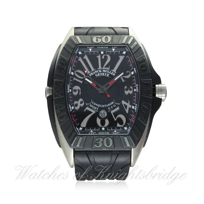 A RARE GENTLEMAN'S FRANCK MULLER CONQUISTADOR SPORT GPG TITANIUM WRIST WATCH CIRCA 2012, REF. 9900 SC DT GPG WITH ORIGINAL BOX D: Black 'Flamme' dial with graduated silver Arabic numerals, date aperture. M: Automatic movement with 42 hour power reserve, signed Franck Muller, platinum rotor, calibre FM 800 C: Tonneau shaped case, black titanium bezel with 60 minute markers, signed Franck Muller Geneve & numbered, original crown, case width measures approx. 48mm. S: Original Franck Muller black rubber strap & folding clasp. CONDITION REPORT D: Original dial in mint condition. M: Working at present. C: In excellent condition. S: In excellent condition, strap is slightly short. D: Dial / M: Movement / C: Case / S: Strap / B: Bracelet