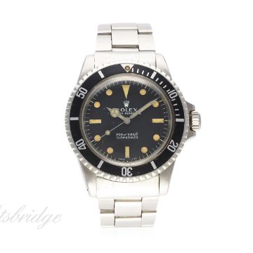 A RARE GENTLEMAN'S STAINLESS STEEL ROLEX OYSTER PERPETUAL SUBMARINER BRACELET WATCH CIRCA 1966, REF. 5513 "METERS FIRST" DIAL D: Matt black dial with luminous markers & Mercedes hands. M: 26 jewel automatic movement, signed Rolex & numbered, calibre 1520. C: Oyster case with 60 minute rotating bezel, signed Montres Rolex S.A., dated III.66, numbered, Rolex crown, case diameter measures approx. 40mm. B: Rolex Oyster Submariner bracelet, numbered VB/9315/380. CONDITION REPORT D: Original dial in excellent condition, luminous showing a nice patina. M: Working at present. C: In excellent condition, with some light scratches due to general use. B: In very good condition. D: Dial / M: Movement / C: Case / S: Strap / B: Bracelet