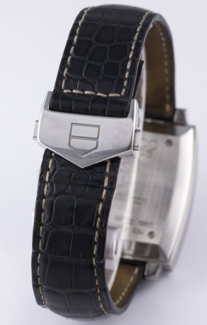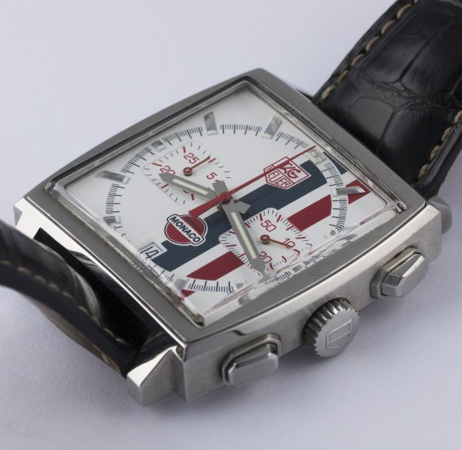 A GENTLEMAN'S STAINLESS STEEL TAG HEUER MONACO AUTOMATIC CHRONOGRAPH WRIST WATCH CIRCA 2008, REF. CW2118 VINTAGE LIMITED EDITION OF 4000 PIECES, WITH TAG HEUER BOX D: White dial with racing stripes, silver batons with minute track, double register recording minutes & continuous seconds, date aperture at 6 o'clock. M: Automatic movement signed TAG Heuer. C: Classic square Monaco case, signed TAG Heuer Monaco Vintage & numbered, original crown & pushers, case width measures approx. 38mm. S: Original TAG Heuer leather strap & deployment clasp. CONDITION REPORT D: Original dial in mint condition. M: Working at present. C: In excellent condition, with some light scratches due to general use. S: In very good condition. D: Dial / M: Movement / C: Case / S: Strap / B: Bracelet