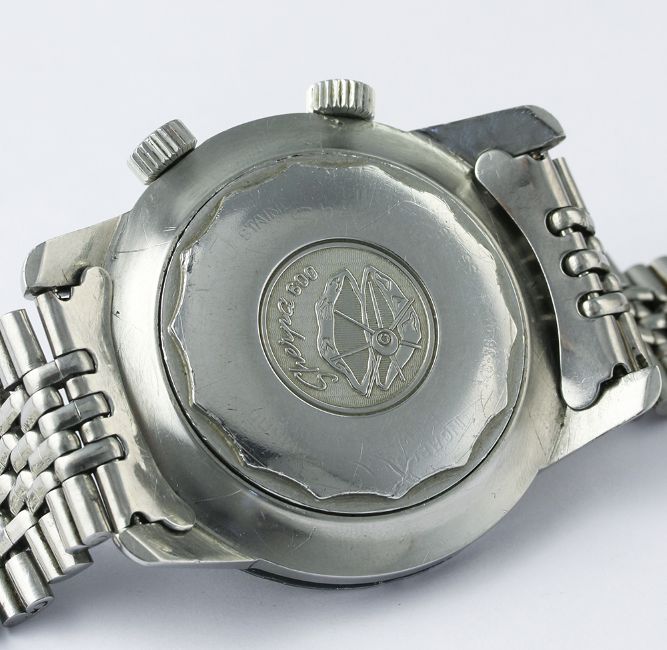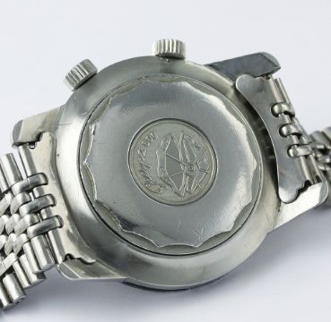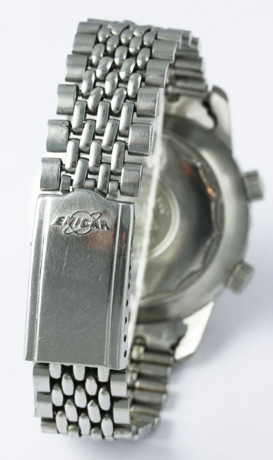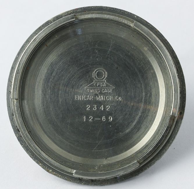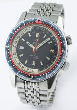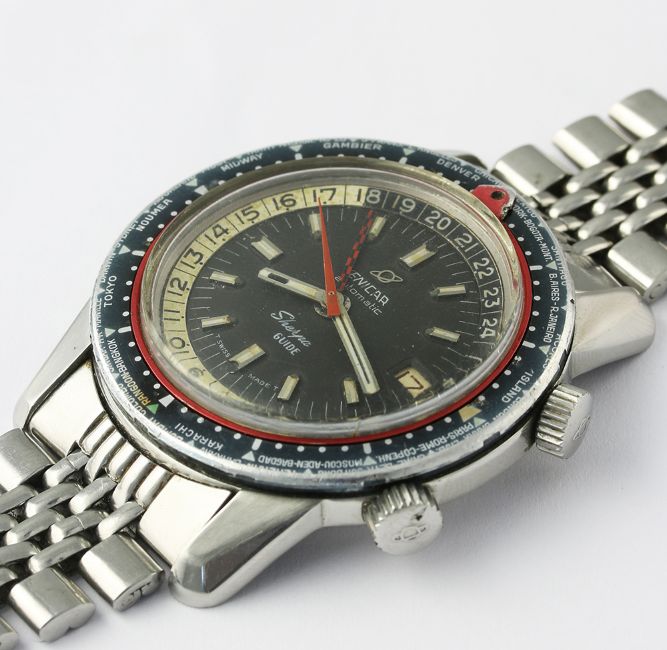 A RARE GENTLEMAN'S STAINLESS STEEL ENICAR SHERPA GUIDE 600 WORLD TIME GMT BRACELET WATCH CIRCA 1960s, REF. 148-35-01A D: Black dial with inlaid silver batons, date aperture, inner rotating 24 hour day & night bezel, black & red GMT hand. M: Automatic movement signed Enicar. C: Compressor type case with world time bezel, Enicar crowns, signed Enicar & numbered, Sherpa 600 emblem embossed on case back, case diameter measures approx. 43mm. B: Original Enicar "beads of rice" bracelet. CONDITION REPORT D: Original dial in very good condition, showing some small signs of age. M: Working at present. C: In very good condition, with some light scratches due to general use, some wear to edge of the bezel. B: In good condition showing some signs of wear. D: Dial / M: Movement / C: Case / S: Strap / B: Bracelet