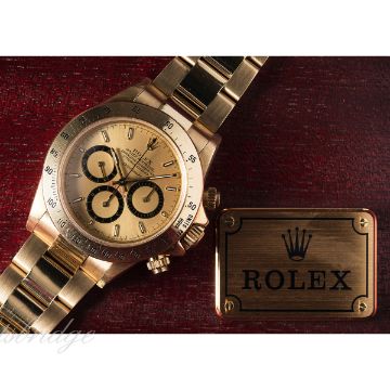 A FINE & RARE GENTLEMAN'S 18K SOLID GOLD ROLEX OYSTER PERPETUAL COSMOGRAPH "FLOATING DIAL" DAYTONA BRACELET WATCH CIRCA 1988, REF. 16528 WITH ROLEX BOX D: Champagne dial with luminous inlaid gold batons, triple register with black rings, recording hours, minutes & continuous seconds. M: 31 jewel automatic chronometer movement, signed Montres Rolex S.A. & numbered, Zenith El Primero base movement calibre 4030. C: Oyster case with units per hour bezel, sapphire crystal, signed Montres Rolex S.A., R serial no., hallmarked, Rolex screw down crown & pushers, case diameter measures approx. 39mm. B: Original 18k solid gold Rolex Oyster Daytona bracelet, numbered 78668/103. CONDITION REPORT D: Original dial in mint condition. M: Working at present. C: In excellent condition, with some light scratches due to general use. B: In excellent condition. D: Dial / M: Movement / C: Case / S: Strap / B: Bracelet