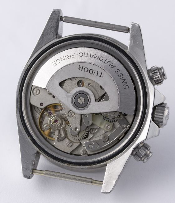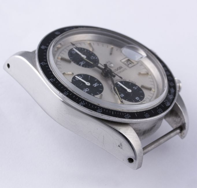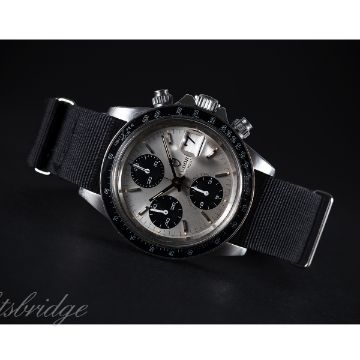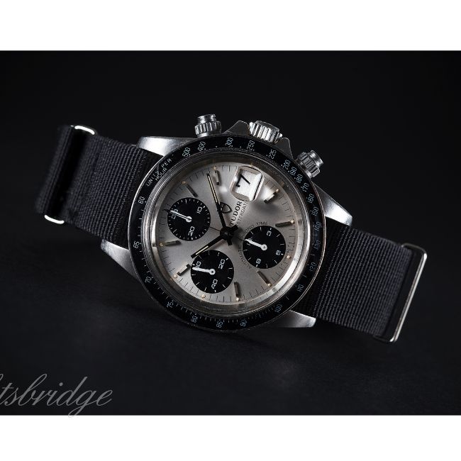 A RARE GENTLEMAN'S STAINLESS STEEL ROLEX TUDOR OYSTERDATE CHRONO TIME "BIG BLOCK" CHRONOGRAPH WRIST WATCH CIRCA 1980s, REF. 94200 D: Silver dial with silver batons, three black registers recording hours, minutes & continuous seconds, date aperture. M: Automatic movement signed Tudor, Valjoux calibre 7750. C: Circular case with units per hour bezel, signed Montres Tudor S.A., numbered, case back inscription, Rolex screw down crown & pushers, case diameter measures approx. 40mm. S: NATO strap. CONDITION REPORT D: Original dial in excellent condition, showing some very small signs of age. M: Working at present. C: In good condition, with some scratches due to use. S: New. D: Dial / M: Movement / C: Case / B: Bracelet / S: Strap
