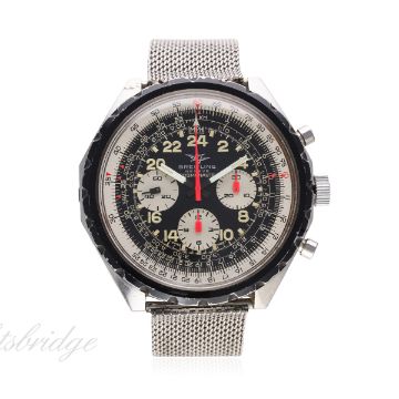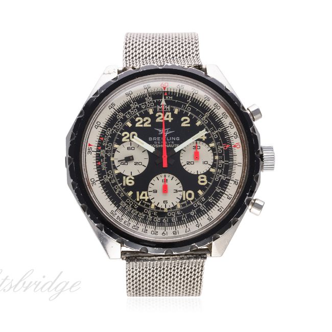 A RARE GENTLEMAN'S STAINLESS STEEL BREITLING COSMONAUTE CHRONOGRAPH WRIST WATCH CIRCA 1970s, REF. 0819 D: Black dial with luminous 24 hour markers, three silver registers recording minutes, hours & continuous seconds, silver inner rotating slide rule bezel. M: Manual wind movement signed Breitling Watch Co, calibre Venus 178. C: Large case, signed Breitling & numbered, case width measures approx. 48mm. B: Stainless steel Moblot bracelet. CONDITION REPORT D: Original dial in excellent condition. M: Working at present. C: In excellent condition, with some light scratches & wear due to general use. B: In very good condition. D: Dial / M: Movement / C: Case / S: Strap / B: Bracelet.