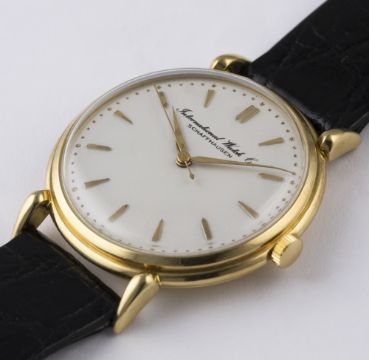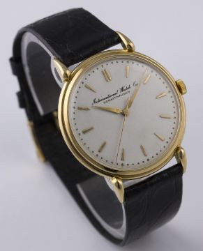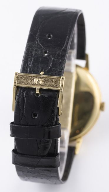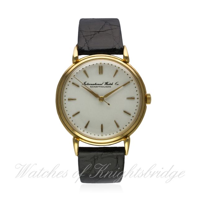 A GENTLEMAN'S LARGE SIZE 18K SOLID GOLD IWC WRIST WATCH CIRCA 1950s D: Silver dial with gilt batons & "dagger" hands. M: Manual wind movement, signed International Watch Co. & numbered, calibre 89. C: Circular case with "claw" lugs, signed IWC, hallmarked & numbered, case diameter measures approx. 36mm. S: Black leather IWC strap & pin buckle. CONDITION REPORT D: Dial in excellent condition, showing some very small signs of age. M: Working at present. C: In excellent condition. S: In excellent condition. D: Dial / M: Movement / C: Case / S: Strap / B: Bracelet