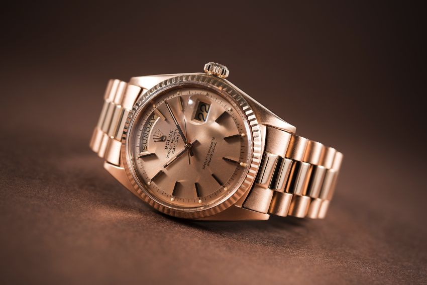 A FINE & RARE GENTLEMAN'S 18K SOLID PINK GOLD ROLEX OYSTER PERPETUAL DAY DATE BRACELET WATCH CIRCA 1968, REF. 1803 D: Champagne dial with pink gold batons & hands, day & date apertures. M: Automatic chronometer movement, signed Rolex & numbered, calibre 1556. C: Oyster case with fluted bezel, signed Montres Rolex S.A., 18k hallmarks, numbered, Rolex crown, case diameter measures approx. 36mm. B: Original Rolex President 18k solid pink gold bracelet, dated I.70. CONDITION REPORT D: Original dial in excellent condition. M: Working at present. C: In excellent condition. B: In excellent condition. D: Dial / M: Movement / C: Case / S: Strap / B: Bracelet