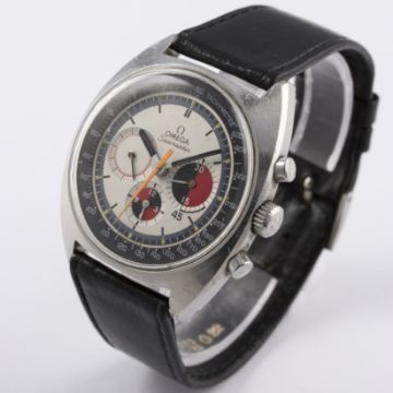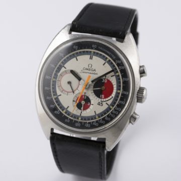 A RARE GENTLEMAN'S STAINLESS STEEL OMEGA SEAMASTER "SOCCER TIMER" CHRONOGRAPH WRIST WATCH CIRCA 1970, REF. 145.020 D: White dial with grey chapter ring, triple register recording hours, minutes with 45 minute half time indicator, & continuous seconds, inner tachymetre bezel. M: 17 jewel manual wind movement, signed Omega & numbered, calibre 861. C: Tonneau shaped case, signed Omega Watch Co., Seamaster emblem on case back, Omega crown & pushers, case width measures approx. 41mm. S: Black leather strap.CONDITION REPORT D: Original dial in excellent condition, showing some very small signs of age. M: Working at present. C: In very good condition, with some small scratches due to general use. S: In excellent condition. D: Dial / M: Movement / C: Case / S: Strap / B: Bracelet