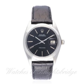 A GENTLEMAN'S STAINLESS STEEL ROLEX OYSTERDATE PRECISION WRIST WATCH CIRCA 1971, REF. 6694 D: Black dial with silver batons & hands, date aperture. M: 17 jewel manual wind movement, signed Montres Rolex S.A. & numbered, calibre 1225. C: Oyster case, signed Montres Rolex S.A., dated I.71, numbered, Rolex crown, case diameter measures approx. 35mm. S: Black leather strap.CONDITION REPORT D: Dial in excellent condition. M: Working at present. C: In excellent condition. S: New. D: Dial / M: Movement / C: Case / S: Strap / B: Bracelet