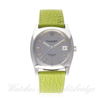 A RARE GENTLEMAN'S STAINLESS STEEL IWC GOLF CLUB AUTOMATIC SL WRIST WATCH CIRCA 1970 D: Silver dial with luminous inlaid silver batons & hands, date aperture. M: Automatic movement signed International Watch Co. & numbered, calibre C8541B. C: Cushion shaped case, signed IWC Golf-Club, IWC crown, case width measures approx 35mm. S: Green leather strap.CONDITION REPORT D: Original dial in excellent condition. M: Working at present. C: In excellent condition. S: New. D: Dial / M: Movement / C: Case / S: Strap / B: Bracelet