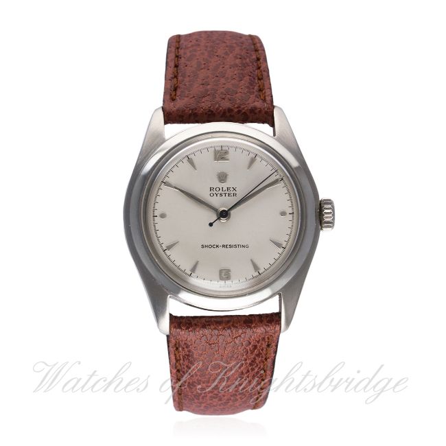 A GENTLEMAN'S STAINLESS STEEL ROLEX OYSTER WRIST WATCH CIRCA 1950 REF. 6082 D: Silver dial with raised silver markers & hands. M: 17 jewel manual wind movement, signed Rolex & numbered, calibre 710. C: Oyster case, signed Rolex Geneva Swiss, numbered, Rolex Super Oyster crown, case diameter measures approx. 34mm. S: Brown leather strap. CONDITION REPORT D: Dial in excellent condition. M: Working at present. C: In excellent condition. S: In excellent condition. D: Dial / M: Movement / C: Case / S: Strap / B: Bracelet
