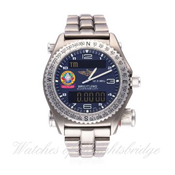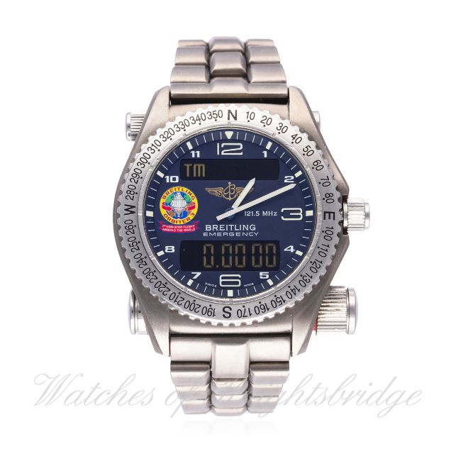 A GENTLEMAN'S TITANIUM BREITLING EMERGENCY ORBITER 3 BRACELET WATCH WITH BOX & PAPERS DATED 1999 REF. E56321 LIMITED EDITION OF 1999 PIECES D: Dial with Arabic numerals & luminous markers, Orbiter 3 logo, multifunction digital displays. M: Quartz movement signed Breitling. C: Circular case with rotating navigational bezel, main and supplementary antenna caps which have not been removed, limited edition number, case back signed & numbered, original crown, case diameter measures approx. 43mm. B: Original Breitling bracelet.CONDITION REPORT D: Original dial in excellent condition. M: Working at present. C: In very good condition, with some surface scratches. S: In very good condition, there is some movement in the bracelet from every day use. D: Dial / M: Movement / C: Case / S: Strap / B: Bracelet