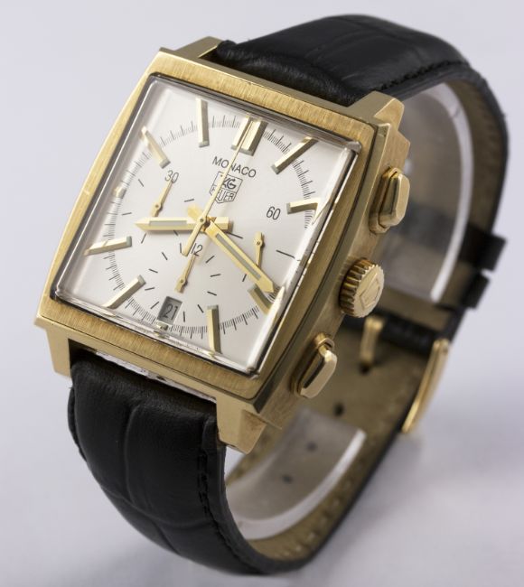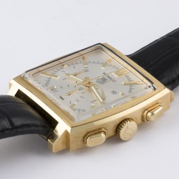 A RARE GENTLEMAN'S 18K SOLID GOLD TAG HEUER MONACO AUTOMATIC CHRONOGRAPH WRIST WATCH CIRCA 2011, REF. CW5140 WITH BOX & PAPERS D: Silver dial with part luminous gilt batons & hands, triple register recording hours, minutes & continuous seconds, date aperture at 6 o'clock. M: Automatic chronometer movement signed TAG Heuer. C: Classic square Monaco case, signed TAG Heuer Monaco & numbered, 18k hallmarks, original crown & pushers, case width measures approx. 38mm. S: Black leather strap with original 18k solid gold TAG Heuer pin buckle.CONDITION REPORT D: Original dial in excellent condition. M: Working at present. C: In excellent condition, with some light scratches due to general use. S: In very good condition. D: Dial / M: Movement / C: Case / S: Strap / B: Bracelet