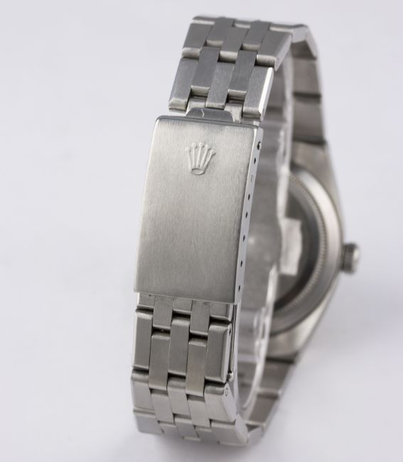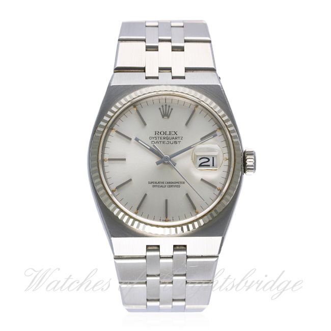 A GENTLEMAN'S STAINLESS STEEL & WHITE GOLD ROLEX OYSTERQUARTZ DATEJUST BRACELET WATCH CIRCA 1980, REF. 17014 D: Silver dial with silver batons, date aperture. M: Quartz chronometer movement quick set date, signed Rolex. C: Tonneau shaped Oyster case with solid white gold fluted bezel, sapphire crystal, signed Montres Rolex S.A, numbered, Rolex crown, case width measures approx. 36mm. B: Original Rolex Jubilee bracelet.CONDITION REPORT D: Original dial in excellent condition. M: Working at present. C: In excellent condition. S: In excellent condition. D: Dial / M: Movement / C: Case / S: Strap / B: Bracelet