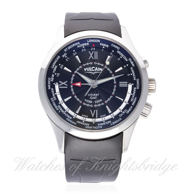 A GENTLEMAN'S STAINLESS STEEL VULCAIN CRICKET GMT ALARM WRIST WATCH CIRCA 2013 REF. 100108.142 D: Black guilloche dial with silver batons & quarterly Arabic numerals, inner rotating dial world time bezel, red arrow hand to set alarm function. M: Manual wind movement signed Vulcain, Cricket calibre V10. C: Circular case with perforated two part case back to enhance the alarm, signed Vulcain & numbered, original crowns, case diameter measures approx. 42mm. S: Original Vulcain black rubber strap & deployment clasp.CONDITION REPORT D: Original dial in mint condition. M: Working at present. C: In excellent condition. S: In excellent condition. D: Dial / M: Movement / C: Case / S: Strap / B: Bracelet
