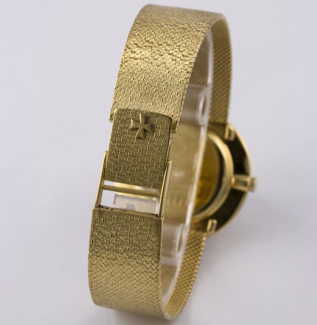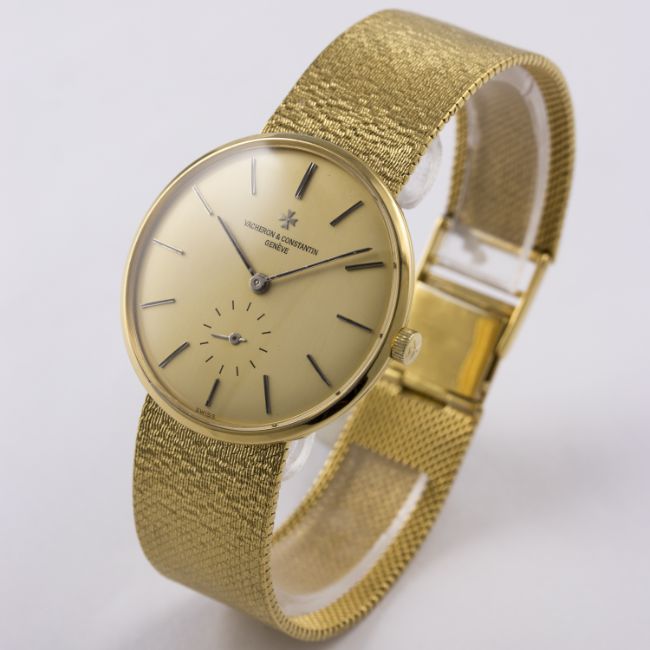 A GENTLEMAN'S 18K SOLID GOLD VACHERON & CONSTANTIN BRACELET WATCH CIRCA 1970s, REF. 6319 D: Champagne dial with black inlaid gilt batons & hands, subsidiary seconds. M: 18 jewel manual wind movement signed Vacheron & Constantin, numbered, calibre 1001/2. C: Circular case signed Vacheron & Constantin, hallmarked & numbered, original crown, case diameter measures approx. 34mm. B: Original Vacheron & Constantin 18k gold integral bracelet, total length measures approx. 185mm.CONDITION REPORT D: Dial in excellent condition. M: Working at present. C: In excellent condition. B: In excellent condition. D: Dial / M: Movement / C: Case / S: Strap / B: Bracelet