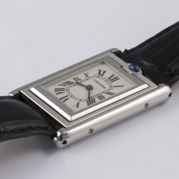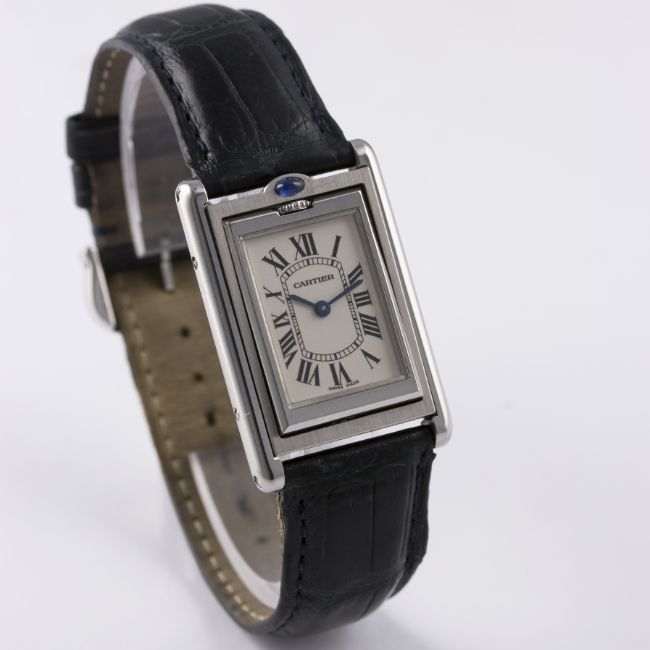 A MID SIZE STAINLESS STEEL CARTIER TANK BASCULANTE WRIST WATCH CIRCA 2002, REF. 2405 D: Silver dial with Roman numerals & inner minute track, secret signature at VII, blue steel hands. M: Quartz movement signed Cartier. C: Reverso style case with blue sapphire, signed Cartier & numbered, case measures approx. 36mm by 24mm. S: Cartier leather strap & pin buckle.CONDITION REPORT D: Original dial in excellent condition. M: Working at present. C: In very good condition. S: In fair condition. D: Dial / M: Movement / C: Case / S: Strap / B: Bracelet