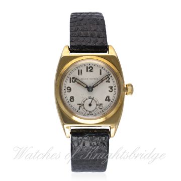 A GENTLEMAN'S 9CT SOLID GOLD ROLEX OYSTER VICEROY WRIST WATCH CIRCA 1940, REF. 3118 D: Silver dial with luminous Arabic numerals & outer chapter ring, subsidiary seconds, luminous filled "pencil" hands. M: 18 jewel manual wind chronometer super balance movement, signed Rolex . C: Tonneau shaped Oyster case, signed Oyster Watch Co. R.W.C. Ltd, hallmarked & numbered, Oyster Patent crown, case width measures approx. 28mm. S: Black leather strap.CONDITION REPORT D: Dial in very good condition, showing some signs of age. M: Working at present. C: In very good condition.  S: In good condition. D: Dial / M: Movement / C: Case / S: Strap / B: Bracelet