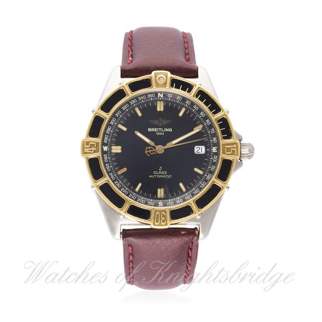 A GENTLEMAN`S STEEL & GOLD BREITLING WINDRIDER J CLASS AUTOMATIC WRIST WATCH CIRCA 1995, REF. 2851 D: Black dial with luminous inlaid markers, date aperture. M: Automatic movement signed Breitling. C: Circular case with black inlaid rotating 60 minute bezel, signed Breitling & numbered, original crown, case diameter measures approx. 40mm. S: Brown leather strap.CONDITION REPORT D: Original dial in excellent condition. M: Working at present. C: In excellent condition with some light scratches due to general use. S: New. D: Dial / M: Movement / C: Case / S: Strap / B: Bracelet