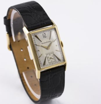 A GENTLEMAN'S 18K SOLID GOLD JAEGER LECOULTRE RECTANGULAR WRIST WATCH CIRCA 1940s D: Two tone silver dial with graduated gilt "dagger" batons & dauphine hands. M: Manual wind movement, signed Jaeger-LeCoultre & numbered. C: Rectangular case, signed LC, numbered & hallmarked, case measures approx. 36mm by 23mm. S: Black leather strap.CONDITION REPORT D: Dial in excellent condition. M: Working at present. C: In excellent condition. S: In excellent condition. D: Dial / M: Movement / C: Case / S: Strap / B: Bracelet