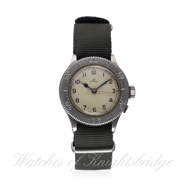 A GENTLEMAN'S STAINLESS STEEL OMEGA BRITISH AIR MINISTRY PILOTS WRIST WATCH CIRCA 1940 BATTLE OF BRITAIN D: Silver dial with Arabic numerals & outer minute track. M: 15 jewel manual wind movement signed Omega & numbered. C: Circular case with fixed bars, issue numbers 6B 159 5363/40, 60 minute rotating bezel (missing crown and clamp that holds the bezel), numbered, case diameter measures approx. 33mm. S: NATO strap.CONDITION REPORT D: Original dial in excellent condition. M: Working at present. C: In very good condition, case back showing some wear. S: In very good condition. D: Dial / M: Movement / C: Case / S: Strap / B: Bracelet