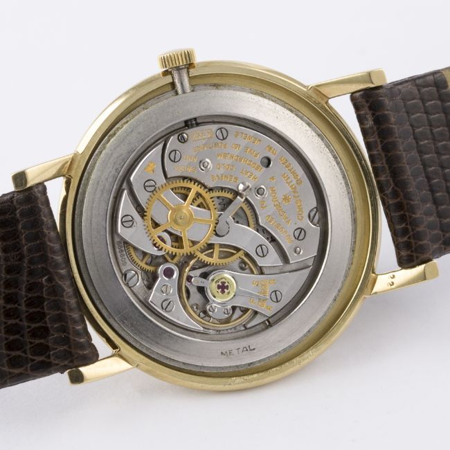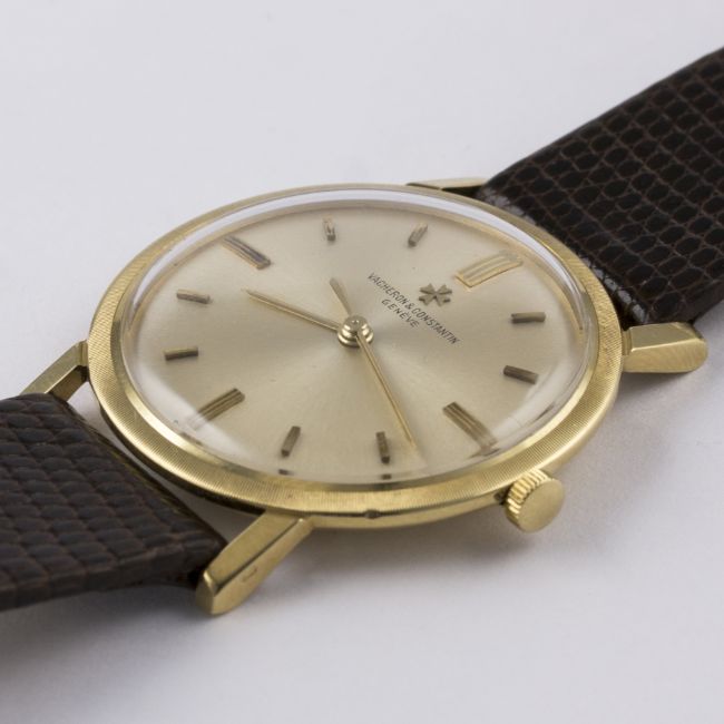 A GENTLEMAN'S 18K SOLID GOLD VACHERON & CONSTANTIN WRIST WATCH CIRCA 1960, REF. 6406 D: Silver dial with gilt batons & hands. M: 18 jewel manual wind movement signed Vacheron & Constantin, numbered, calibre 1002. C: Circular case signed Vacheron & Constantin, hallmarked & numbered, case diameter measures approx. 33mm. S: Leather strap with original 18k solid gold pin buckle.CONDITION REPORT D: Original dial in very good condition. M: Working at present. C: In very good condition with some light scratches due to general use. S: In very good condition. D: Dial / M: Movement / C: Case / S: Strap / B: Bracelet
