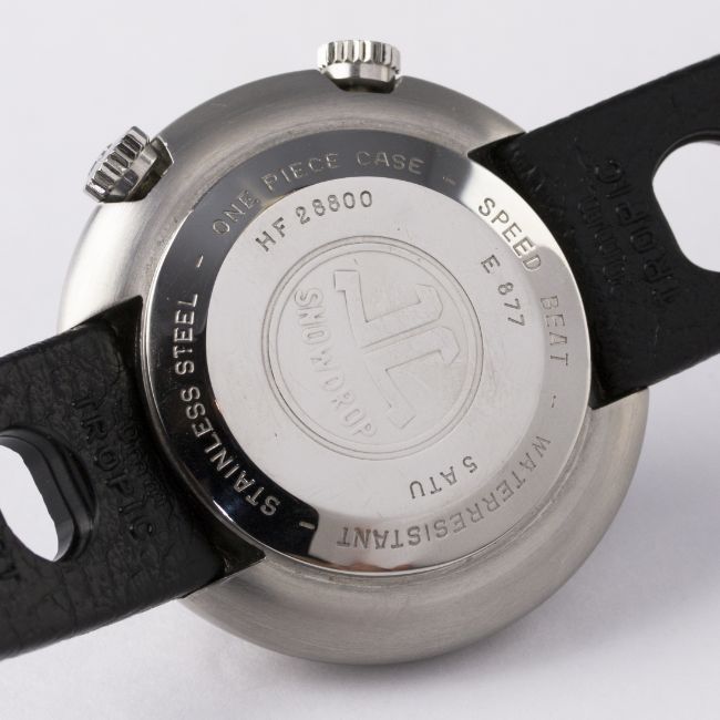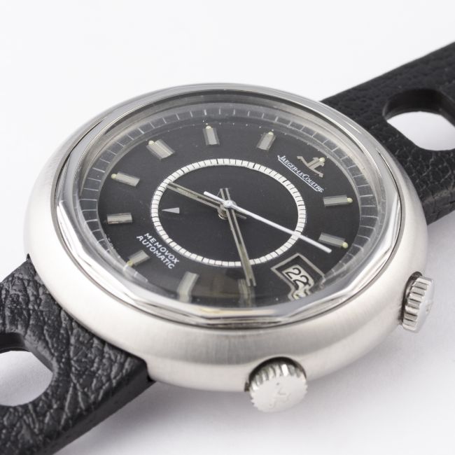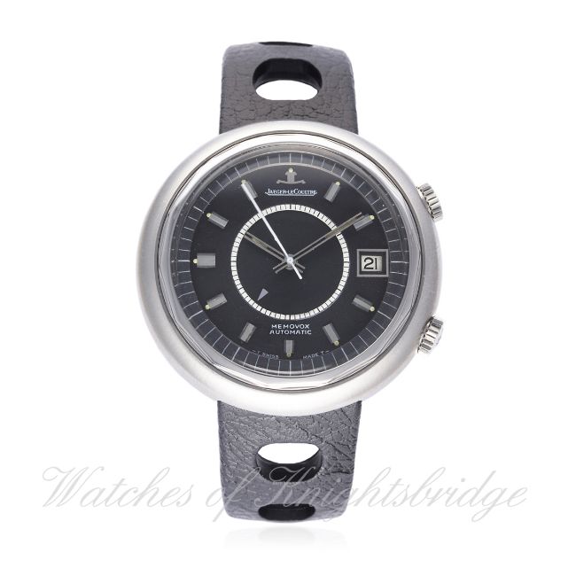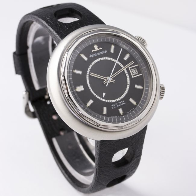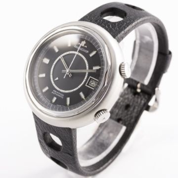 A RARE GENTLEMAN'S STAINLESS STEEL JAEGER LECOULTRE MEMOVOX SNOWDROP AUTOMATIC ALARM WRIST WATCH CIRCA 1970s REF. E877 D: Black dial with silver batons & hands, inner rotating dial with pointer to set alarm, date aperture. M: Automatic movement signed Jaeger-LeCoultre & numbered. C: Circular one piece case, signed Jaeger-LeCoultre Snowdrop & numbered, JLC crowns, case diameter measures approx. 43mm. S: Black rubber Tropic strap.CONDITION REPORT D: Original dial in excellent condition. M: Working at present. C: In excellent condition. S: New. D: Dial / M: Movement / C: Case / S: Strap / B: Bracelet