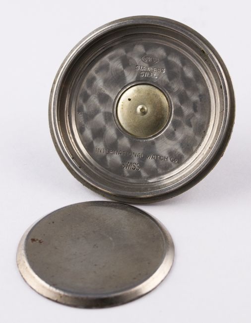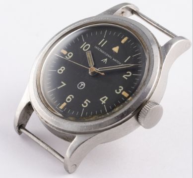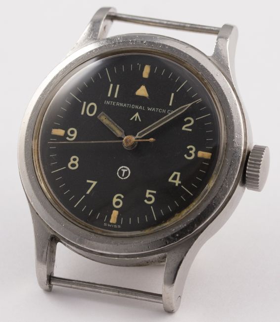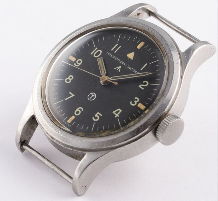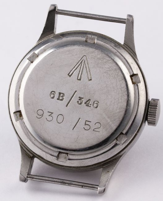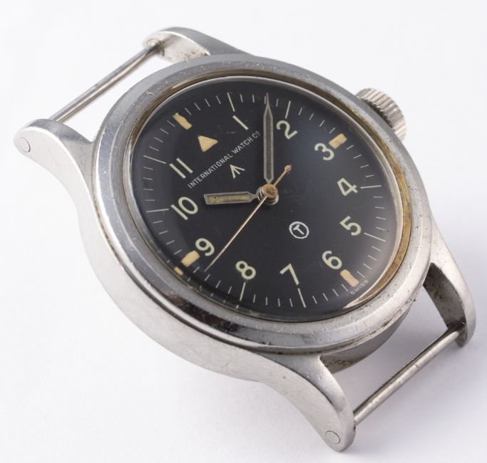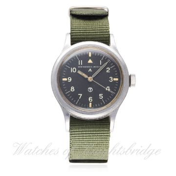 A GENTLEMAN'S STAINLESS STEEL BRITISH MILITARY RAF IWC MARK 11 PILOTS WRIST WATCH DATED 1952 D: Black dial with Arabic numerals & Tritium luminois markers, military arrow. M: Manual wind movement signed International Watch Co. with military arrow & numbered, calibre 89 with "hacking" seconds. C: Military case with fixed bars, issue markings ^ 6B/346 930/52, dust cover, case diameter measures approx 36mm. S: Green NATO strap.CONDITION REPORT D: MOD dial in excellent condition. M: Working at present. C: In very good condition, with some small scratches due to general use. S: New. D: Dial / M: Movement / C: Case / S: Strap / B: Bracelet