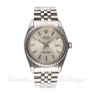 A GENTLEMAN'S STAINLESS STEEL ROLEX OYSTER PERPETUAL DATEJUST BRACELET WATCH CIRCA 1977, REF. 1603 D: Silver dial with silver batons & hands, date aperture. M: 26 jewel automatic chronometer movement, signed Montres Rolex S.A., calibre 1570. C: Oyster case with milled steel bezel, signed Montres Rolex S.A. & numbered, case back ref. 1601, Rolex crown, case diameter measures approx. 36mm B: Rolex Jubilee bracelet, numbered 62510H/555.CONDITION REPORT D: Original dial in excellent condition. M: Working at present. C: In excellent condition with some surface scratches.. B: In excellent condition with some light scratches. D: Dial / M: Movement / C: Case / S: Strap / B: Bracelet