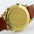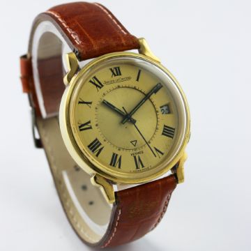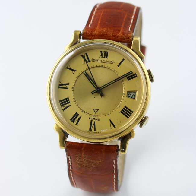 A RARE GENTLEMAN'S GOLD FILLED JAEGER LECOULTRE MEMOVOX ALARM WRIST WATCH CIRCA 1970s RETAILED BY HERMES WITH ORIGINAL BOX D: Champagne dial with black Roman numerals, inner rotating dial with pointer to set alarm, date aperture, signed Hermes. M: Manual wind movement signed Jaeger-LeCoultre & numbered, calibre 911. C: Circular case, signed LeCoultre Co. & numbered, JLC crowns, case diameter measures approx. 36mm. S: Brown leather strap.CONDITION REPORT D: Original dial in excellent condition showing small signs of age. M: Working at present. C: In very good condition. S: In excellent condition. D: Dial / M: Movement / C: Case / S: Strap / B: Bracelet