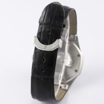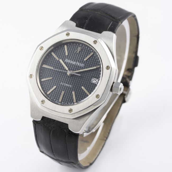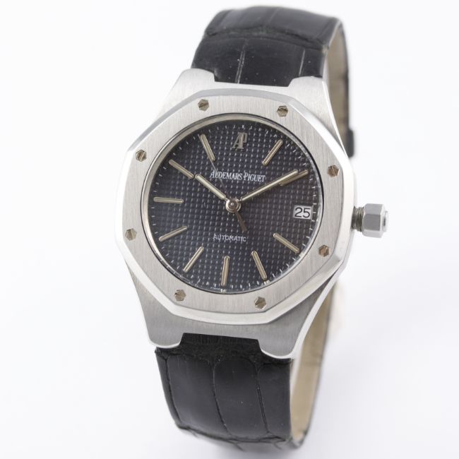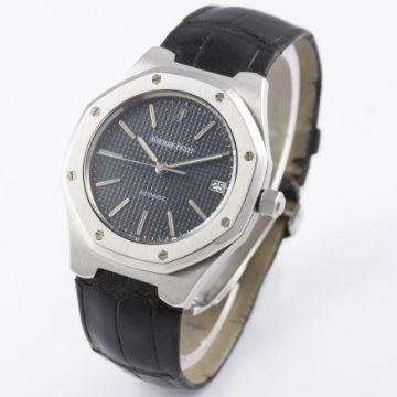 A GENTLEMAN'S STAINLESS STEEL AUDEMARS PIGUET ROYAL OAK AUTOMATIC WRIST WATCH CIRCA 2002, REF. ST. 14800 WITH BOX & PAPERS D: Blue tapisserie dial with luminous inlaid white gold batons & hands, date aperture. M: Automatic movement signed Audemars Piguet. C: Octagonal shaped case, signed Royal Oak & numbered, original crown, case width measures approx. 36mm. S: Audemars Piguet leather strap & deployment clasp. CONDITION REPORT D: Original dial in excellent condition. M: Working at present. C: In excellent condition. S: In very good condition. D: Dial / M: Movement / C: Case / S: Strap / B: Bracelet