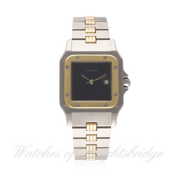A GENTLEMAN'S STEEL & GOLD CARTIER SANTOS AUTOMATIC BRACELET WATCH CIRCA 1990 D: Black dial with gilt hands, date aperture. M: Automatic movement signed Cartier. C: Square Santos case with solid gold bezel, signed santos de Cartier Automatique & numbered, original sapphire crown, case width measures approx. 29mm. B: Original Cartier steel & solid gold special edition bracelet.CONDITION REPORT  D: Original dial in excellent condition. M: Working at present. C: In excellent condition, with some light scratches due to general use. B: In excellent condition.  D: Dial / M: Movement / C: Case / S: Strap / B: Bracelet