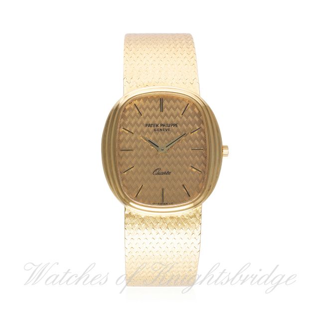 A GENTLEMAN'S 18K SOLID GOLD PATEK PHILIPPE QUARTZ ELLIPSE BRACELET WATCH CIRCA 1980s D: Gold patterned dial with black inlaid gold batons & hands. M: Quartz movement signed Patek Philippe & numbered. C: Ellipse case, signed Patek Philippe, hallmarked & numbered, original crown, case width measures approx. 31mm. B: Original Patek Philippe 18k solid gold integral bracelet, total length measures approx. 186mm. CONDITION REPORT D: Original dial in excellent condition. M: Working at present. C: In excellent condition. B: In excellent condition. D: Dial / M: Movement / C: Case / S: Strap / B: Bracelet