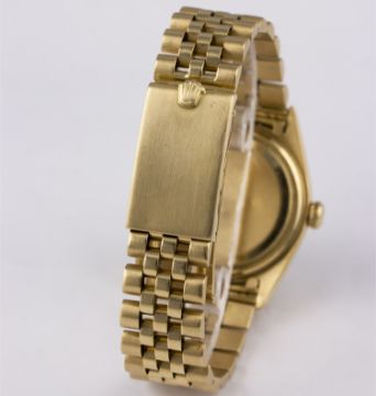 A RARE GENTLEMAN'S 18K SOLID GOLD ROLEX OYSTER PERPETUAL DATEJUST BRACELET WATCH CIRCA 1960, REF. 1601 D: Silver dial with gilt faceted batons & "dagger" hands, date aperture. M: 25 jewel automatic chronometer movement, signed Rolex & numbered, calibre 1560. C: Oyster case with fluted bezel, signed Montres Rolex S.A., hallmarked, numbered on inside case back and in between lugs, Rolex crown, case diameter measures approx. 36mm. B: Original 18k solid gold Rolex Jubilee bracelet, dated 2.65.CONDITION REPORT D: Original dial in excellent condition. M: Working at present. C: In excellent condition. S: In excellent condition, with some light surface scratches due to general use. D: Dial / M: Movement / C: Case / S: Strap / B: Bracelet
