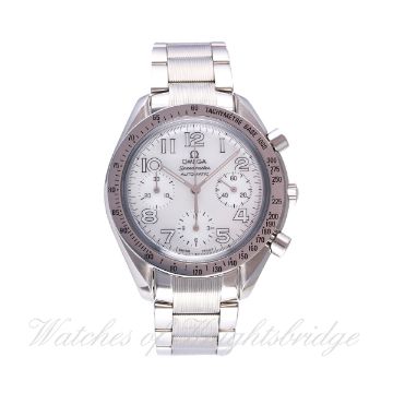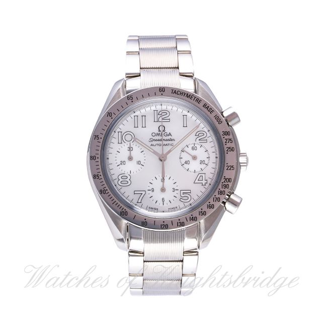A LADIES STAINLESS STEEL OMEGA SPEEDMASTER AUTOMATIC CHRONOGRAPH BRACELET WATCH CIRCA 2009, REF. 35347000 WITH BOX & OPEN PAPERS D: Blue mother of pearl dial with luminous Arabic numerals, triple registers recording hours, minutes & continuous seconds. M: Automatic movement, signed Omega & numbered, calibre 3220. C: Circular case with tachymetre bezel, signed Omega Watch Co., Speedmaster emblem embossed on case back, numbered, Omega crown & pushers, case diameter measures approx. 39mm. B: Original Omega bracelet, numbered 62/1553/939.CONDITION REPORT D: Original dial in mint condition. M: Working at present. C: In excellent condition. B: In excellent condition. D: Dial / M: Movement / C: Case / S: Strap / B: Bracelet