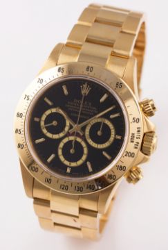 A FINE & RARE GENTLEMAN'S 18K SOLID GOLD ROLEX OYSTER PERPETUAL COSMOGRAPH "FLOATING DIAL" DAYTONA BRACELET WATCH CIRCA 1988, REF. 16528 D: Black dial with luminous inlaid gold batons, triple register with gilt rings recording hours, minutes & continuous seconds. M: 31 jewel automatic chronometer movement, signed Montres Rolex S.A. & numbered, Zenith El Primero base movement calibre 4030. C: Oyster case with units per hour bezel, sapphire crystal, signed Montres Rolex S.A., R serial no., hallmarked, Rolex screw down crown & pushers, case diameter measures approx. 39mm. B: Original 18k solid gold Rolex Oyster Daytona bracelet, numbered 78668/103.CONDITION REPORT D: Original dial in excellent condition. M: Working at present. C: In excellent condition. B: In excellent condition. D: Dial / M: Movement / C: Case / S: Strap / B: Bracelet