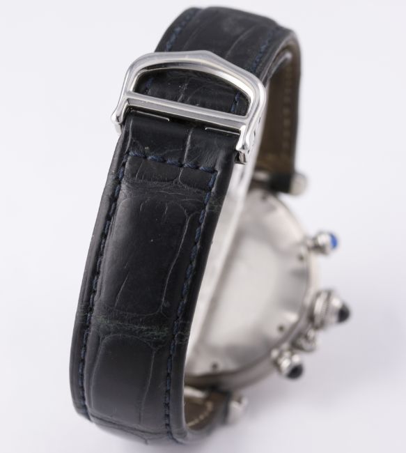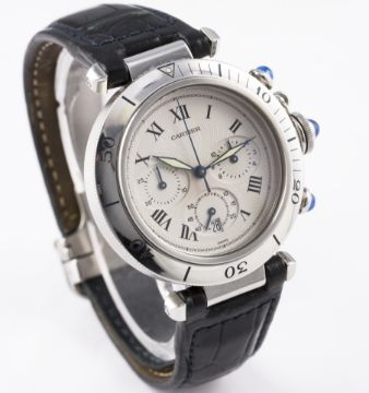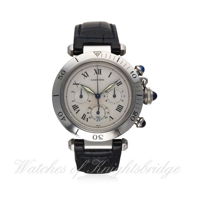 A GENTLEMAN'S STAINLESS STEEL CARTIER PASHA CHRONOGRAPH WRIST WATCH CIRCA 2000s, REF. 1050 1 D: Silver dial with Roman numerals, triple register recording hours, minutes & continuous seconds, date aperture. M: Quartz movement signed Cartier. C: Circular case with bar lugs, 60 minute rotating bezel, signed Pasha de Cartier & numbered, original sapphire set crown guard & pushers, case diameter measures approx. 38mm. S: Cartier leather strap & deployment clasp.CONDITION REPORT D: Original dial in excellent condition. M: Working at present. C: In excellent condition. S: In very good condition, deployment clasp is in excellent condition. D: Dial / M: Movement / C: Case / S: Strap / B: Bracelet