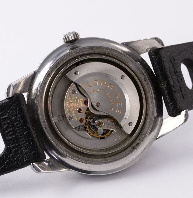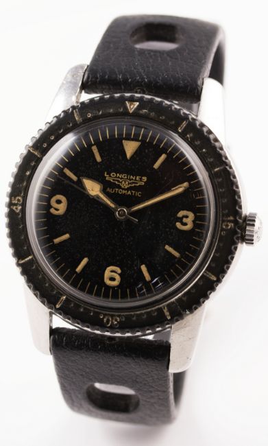 A RARE GENTLEMAN'S STAINLESS STEEL LONGINES NAUTILUS SKIN DIVER WRIST WATCH CIRCA 1957, WITH LONGINES BOX & ORIGINAL MODEL TAG D: Black dial with luminous markers & 3-6-9 Arabic numerals. M: 17 jewel automatic movement signed Longines & numbered, calibre 19 AS. C: Circular case with rotating 60 minute bakelite bezel, signed Longines & numbered, inner case back has a thin antimagnetic lead covering, Longines crown, case diameter measures approx. 40mm. S: Black Tropic strap.CONDITION REPORT D: Original dial in excellent condition showing very small signs of age. M: Working at present. C: In excellent condition with some surface scratches, bezel is in very good condition but showing signs of age. S: In excellent condition. D: Dial / M: Movement / C: Case / S: Strap / B: Bracelet