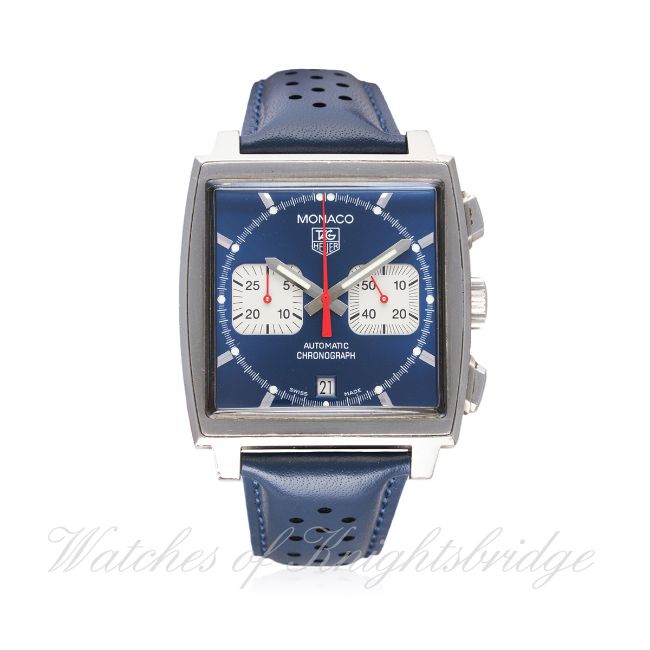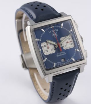 A GENTLEMAN'S STAINLESS STEEL TAG HEUER "STEVE MCQUEEN" MONACO AUTOMATIC CHRONOGRAPH WRIST WATCH CIRCA 2005, REF. CW2113-0 WITH BOX & PAPERS D: Blue dial with silver batons, inner minute track with luminous markers, two silver registers recording minutes & continuous seconds, date aperture at 6 o'clock. M: Automatic movement signed TAG Heuer. C: Classic square Monaco case, signed TAG Heuer Monaco & numbered, original crown & pushers, case width measures approx. 38mm. S: Blue perforated leather strap with deployment clasp.CONDITION REPORT D: Original dial in mint condition. M: Working at present. C: In excellent condition with some light surface scatches. S: New D: Dial / M: Movement / C: Case / S: Strap / B: Bracelet