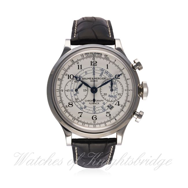 A GENTLEMAN'S STAINLESS STEEL BAUME & MERCIER CAPELAND FLYBACK CHRONOGRAPH WRIST WATCH CIRCA 2014, REF. 65689 UNWORN WITH BOX AND BOOKLET D: Silver dial with Arabic numerals, outer telemeter scale & inner base scale, double register recording minutes & continuous seconds, date aperture, Breguet hands. M: 27 jewel automatic movement signed Baume & Mercier, numbered, Valjoux calibre 7750. C: Circular case with exhibition back, signed Baume & Mercier and numbered, original crown & pushers, case diameter measures approx. 44mm. B: Original black leather strap & pin buckle.CONDITION REPORT D: Original dial in mint condition. M: Working at present. C: In mint condition. S: New. The watch is unworn D: Dial / M: Movement / C: Case / S: Strap / B: Bracelet