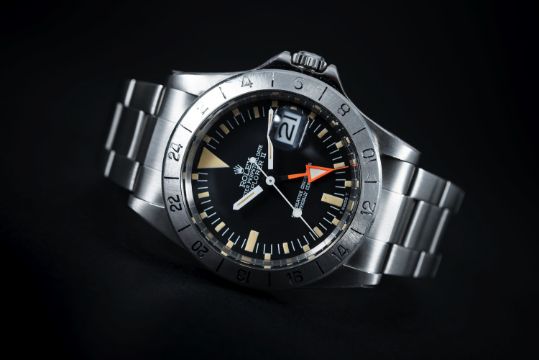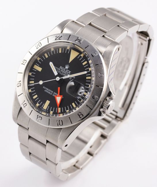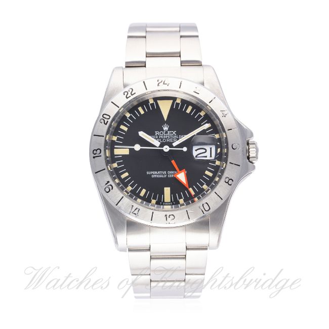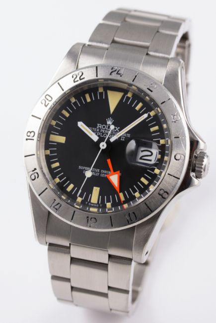 A RARE GENTLEMAN'S STAINLESS STEEL ROLEX OYSTER PERPETUAL DATE EXPLORER II "ORANGE HAND" BRACELET WATCH CIRCA 1978 REF. 1655 "RAIL DIAL" D: Black dial with luminous markers & hands, dual time zone orange hand, date aperture. M: Automatic chronometer movement, signed Rolex & numbered. C: Oyster case with 24 hour bezel, signed Montres Rolex S.A., numbered, Rolex crown, case diameter measures approx. 38mm. B: Rolex Oyster bracelet, numbered V8/78360/580.CONDITION REPORT D: Original dial in excellent condition, luminous showing a nice patina. M: Working at present. C: In excellent condition. B: In excellent condition. D: Dial / M: Movement / C: Case / S: Strap / B: Bracelet