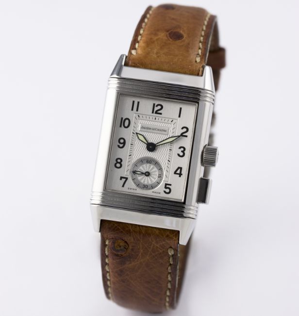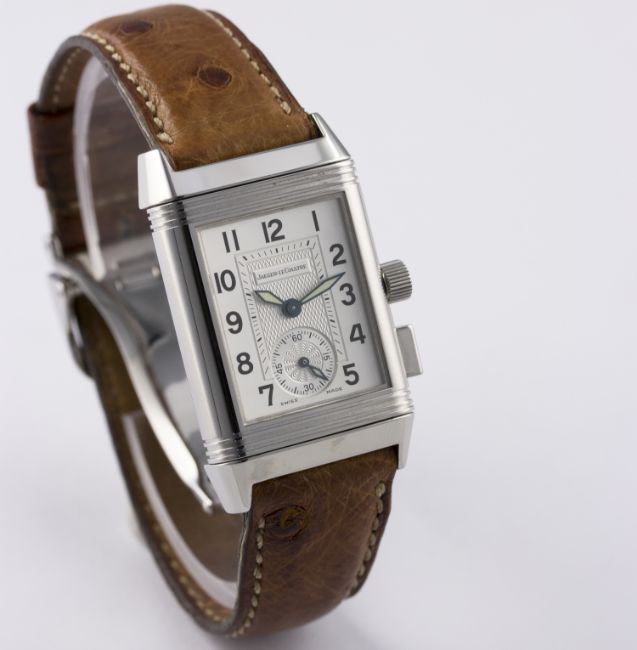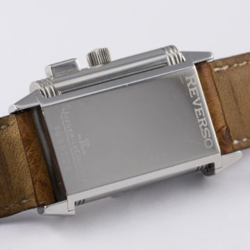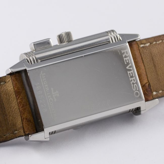 D: Silver dial with black Arabic numerals & inner minute track, subsidiary seconds, black dial on reverse showing a 60 minute totaliser with flyback function. M: Manual wind movement signed Jaeger-LeCoultre & numbered. C: Classic Reverso case, signed Jaeger-LeCoultre Reverso & numbered, original crown & pusher, case measures approx. 39mm by 23mm. S: Original Jaeger-LeCoultre leather strap & deployment clasp.