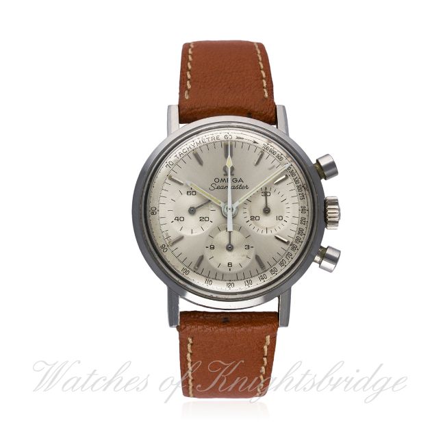 A GENTLEMAN`S STAINLESS OMEGA SEAMASTER CHRONOGRAPH WRIST WATCH CIRCA 1967, REF. 145.005-67 D: Silver dial with faceted silver batons, Speedmaster hands, triple register recording hours, minutes & continuous seconds, tachymetre scale. M: 17 jewel manual wind movement signed Omega Watch Co & numbered, calibre 321. C: Circular case, signed Omega Watch Co., signed Seamaster Waterproof on case back, Omega crown &pushers, case diameter measures approx. 35mm. S: Brown leather strap.CONDITION REPORT D: Original dial in excellent condition with small signs of age. M: Working at present. C: In excellent condition with some surface scratches due to general use. S: New. D: Dial / M: Movement / C: Case / S: Strap / B: Bracelet