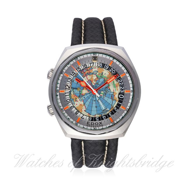 A RARE GENTLEMAN’S STAINLESS STEEL EDOX GEOSCOPE 42 WORLD TIME AUTOMATIC WRIST WATCH CIRCA 1970 D: Inner rotating dial depicting a map of the world with timezones, black & white 24 hour inner rotating bezel, outer silver disc with orange inlaid silver batons & a further 60 minute track. M: Automatic movement. C: Tonneau shaped “super waterproof” one piece case with Edox anti slip crowns, signed Geoscope 42 & numbered, case width measures approx. 42mm. S: Leather strap. CONDITION REPORT D: Original dial in excellent condition, showing light some imperfections to the edge of the outer 60 minute track. M: Working at present. C: In excellent condition, with some light scratches due to general use. S: In excellent condition.   D: Dial / M: Movement / C: Case / S: Strap / B: Bracelet