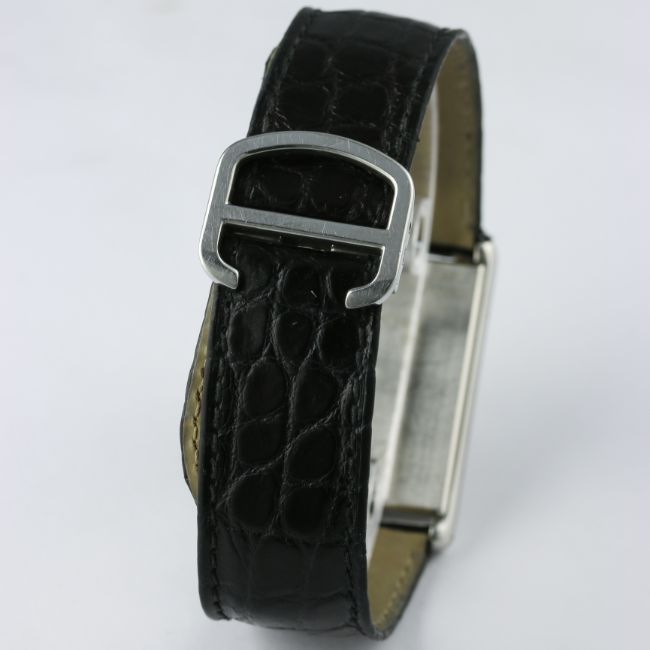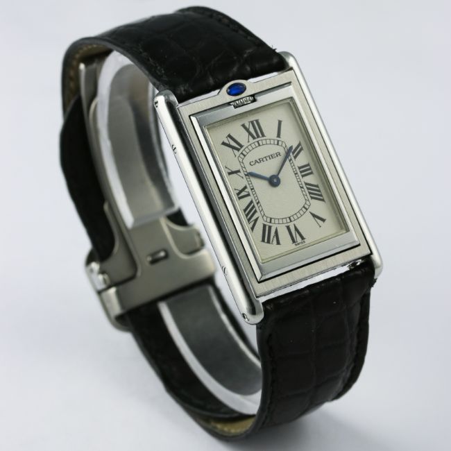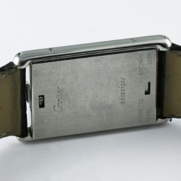 A GENTLEMAN'S STAINLESS STEEL CARTIER TANK BASCULANTE "JUMBO" WRIST WATCH CIRCA 2000s, REF. 2390 D: Silver guilloche dial with Roman numerals & inner minute track, secret signature at VII. M: Manual wind movement signed Cartier. C: Reverso style case, reverse side engraved with initials, signed Cartier mecanique & numbered, case measures approx 39mm by 26mm. S: Cartier leather strap & pin buckle.CONDITION REPORT D: Original dial in excellent condition. M: Working at present. C: In excellent condition with some surface scratches due to general use. S: In very good condition. D: Dial / M: Movement / C: Case / S: Strap / B: Bracelet