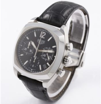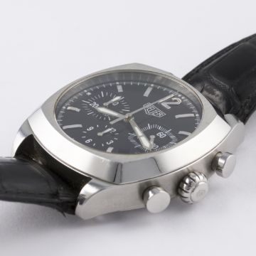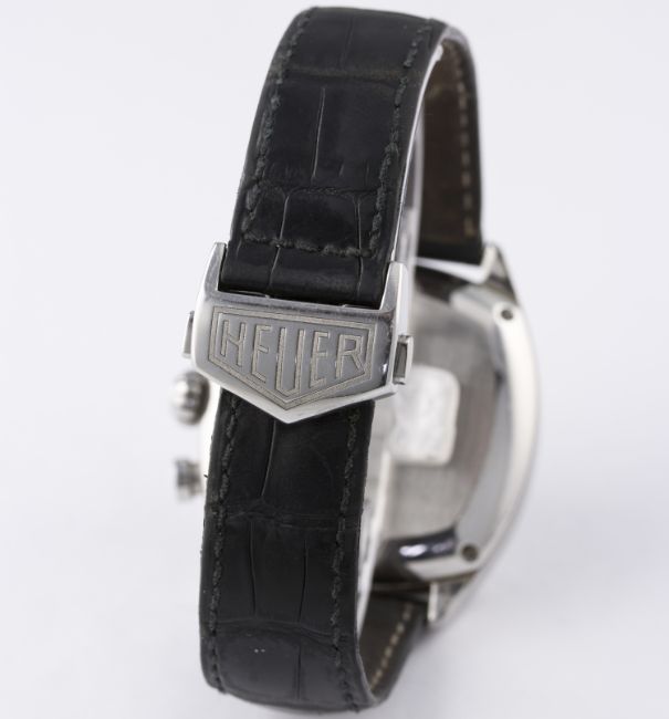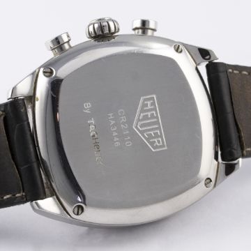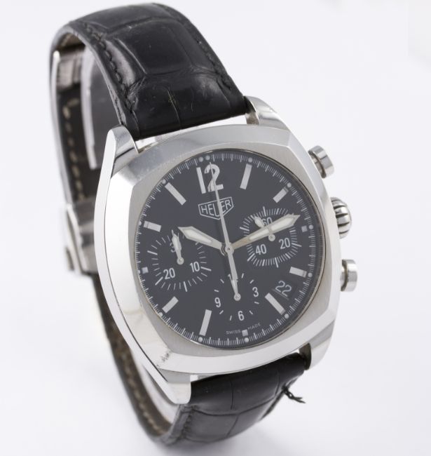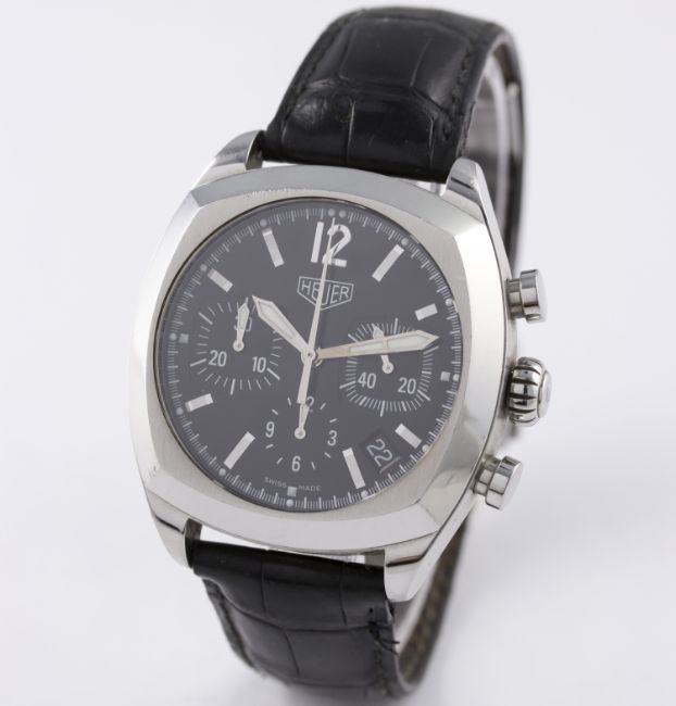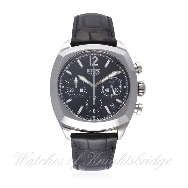 A GENTLEMAN'S STAINLESS STEEL HEUER CLASSIC MONZA CHRONOGRAPH WRIST WATCH CIRCA 2004, REF. CR2110 TAG HEUER RE-EDITION, WITH BOX & OPEN PAPERWORK D: Black dial with silver batons, triple register recording hours, minutes & continuous seconds, date aperture. M: Automatic movement signed Heuer & numbered. C: Cushion shaped case signed Heuer & numbered, Heuer crown & pushers, case width measures approx. 38mm. S: Original Heuer black leather strap & deployment clasp. CONDITION REPORT D: Original dial in excellent condition. M: Working at present. C: In excellent condition, with some light scratches due to general use. S: In good condition.   D: Dial / M: Movement / C: Case / S: Strap / B: Bracelet