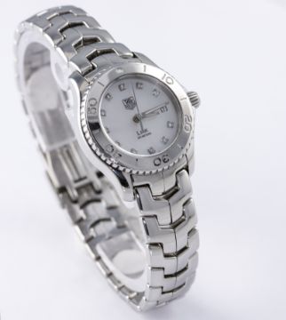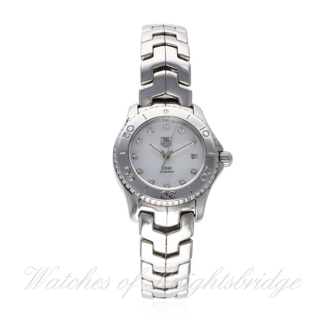 A LADIES STAINLESS STEEL TAG HEUER LINK BRACELET WATCH CIRCA 2010, REF. WJ1319 D: Mother of pearl dial with diamond set hour markers. M: Quartz movement signed TAG Heuer. C: Circular case, with rotating bezel, signed TAG Heuer & numbered, TAG Heuer logo embossed onto case back, TAG Heuer crown, case diameter measures approx. 27mm. B: Original TAG Heuer bracelet. CONDITION REPORT D: Original dial in mint condition. M: Working at present. C: In excellent condition. S: In excellent condition. D: Dial / M: Movement / C: Case / S: Strap / B: Bracelet