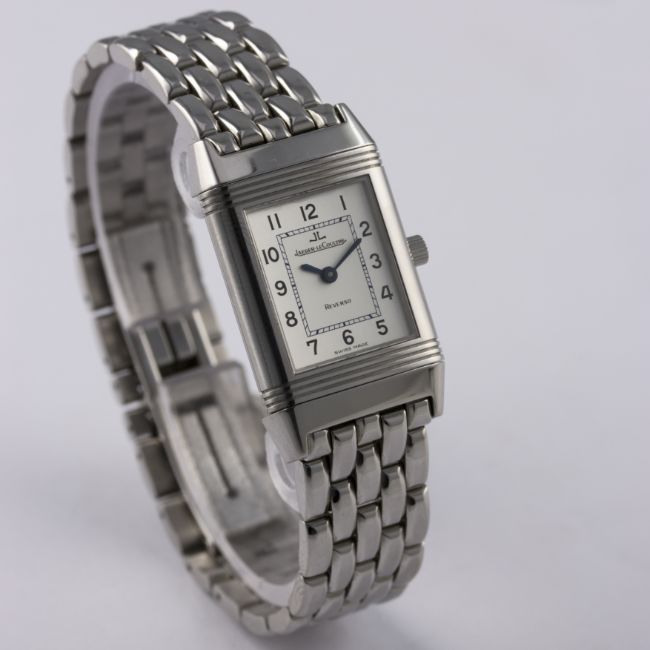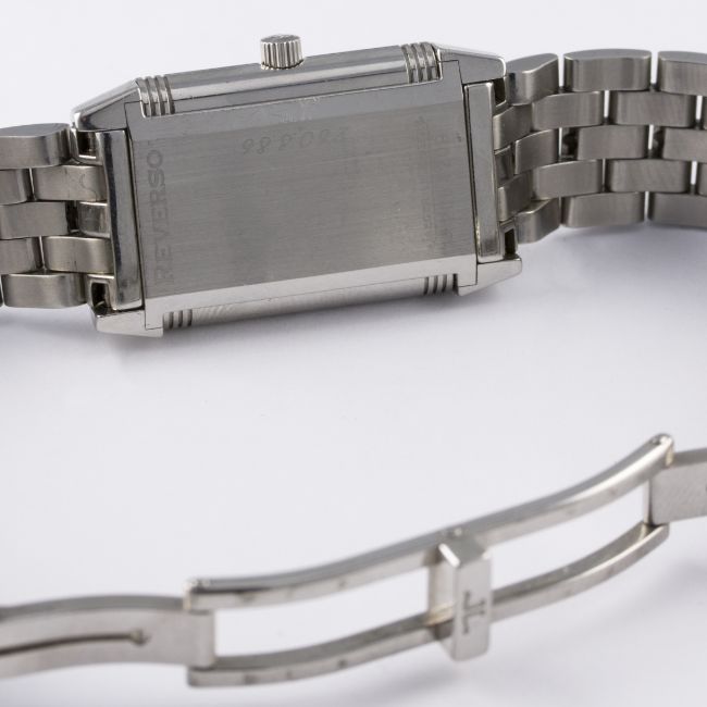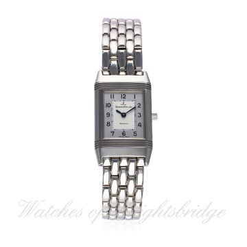 A LADIES STAINLESS STEEL JAEGER LECOULTRE REVERSO BRACELET WATCH CIRCA 2002, REF. 260.8.86 WITH JLC BOX D: Two tone silver dial with black Arabic numerals & inner minute track. M: Manual wind movement, signed Jaeger-LeCoultre & numbered. C: Classic Reverso case with clean reverse side, signed Jaeger-LeCoultre Reverso & numbered, original crown, case measures approx. 34mm by 20mm. B: Original Jaeger-LeCoultre bracelet. CONDITION REPORT D: Original dial in mint condition. M: Working at present. C: In excellent condition. B: In excellent condition. D: Dial / M: Movement / C: Case / S: Strap / B: Bracelet