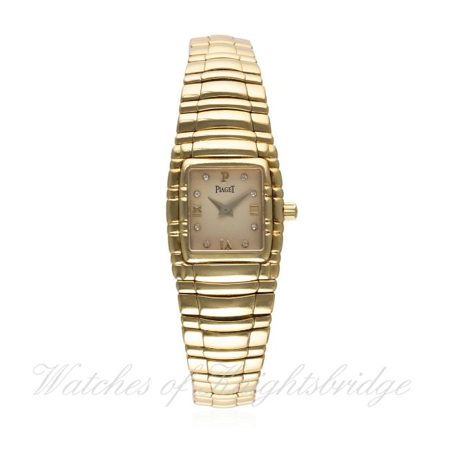 A FINE LADIES 18K SOLID GOLD PIAGET BRACELET WATCH CIRCA 1990s REF. 45051 M 401 D D: Silver dial diamond set markers & Roman numerals. M: Manual wind movement signed Piaget. C: Tonneau shaped case, signed Piaget, hallmarked & numbered, original crown, case width measures approx. 22mm. B: Original Piaget 18k solid gold bracelet.CONDITION REPORT D: Original dial in excellent condition. M: Working at present. C: In excellent condition. B: In excellent condition. D: Dial / M: Movement / C: Case / S: Strap / B: Bracelet
