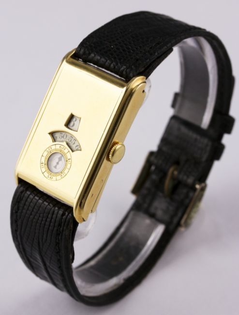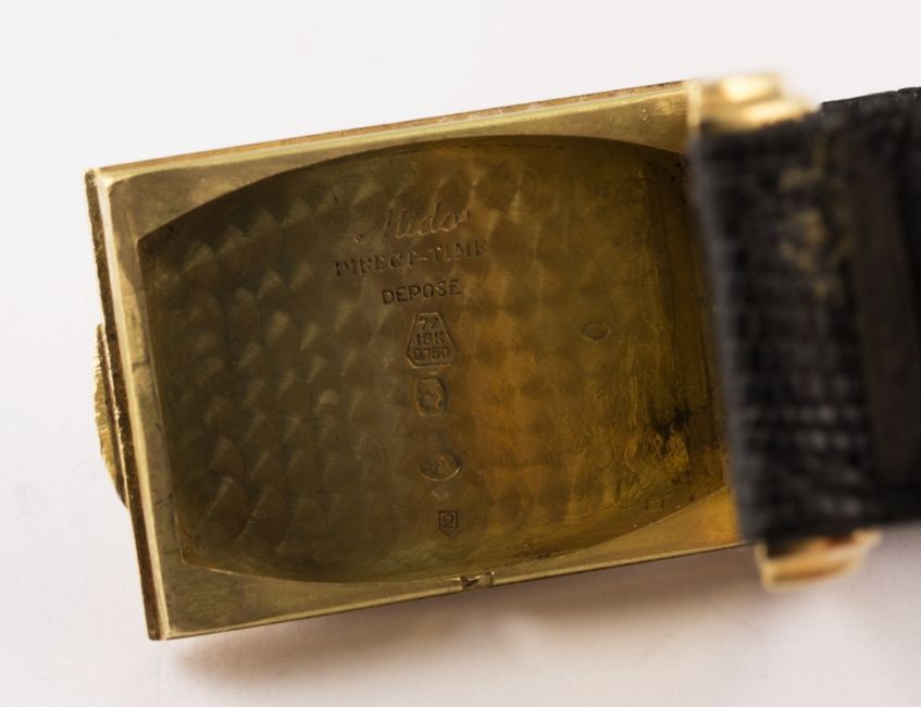 A RARE GENTLEMAN'S 18K SOLID GOLD MIDO 'DIRECT TIME' JUMP HOUR WRIST WATCH CIRCA 1930s. M: 15 jewel manual wind movement signed Mido. C: Rectangular shaped case, three apertures to view hours, minutes & seconds, signed Mido Direct-Time, hallmarked & numbered, case width & length measures approx. 22mm by 36mm. S: Black leather strap.CONDITION REPORT D: Hour, minutes and seconds discs in very good condition. M: Working at present. C: In very good condition with some surface scratches. S: In fair condition. D: Dial / M: Movement / C: Case / S: Strap / B: Bracelet