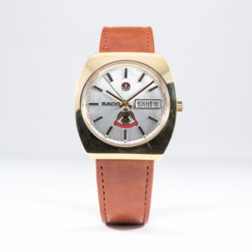 A RARE GENTLEMAN'S GOLD PLATED RADO WRIST WATCH CIRCA 1970s, COMMISSIONED BY UAE MILITARY CENTRAL COMMAND ZONE D: Silver dial with black inlaid batons & hands, day & date apertures, UAE Military Command crest. M: Automatic movement, signed Rado. C: Tonneau shaped case, signed Rado & numbered, original crown, case width measures approx. 36mm. S: Brown leather strap.  £500 £800 $739 $1,182 AED2,710 AED4,336 CONDITION REPORT D: Original dial in excellent condition. M: Working at present. C: In excellent condition. S: In excellent condition. D: Dial / M: Movement / C: Case / S: Strap / B: Bracelet