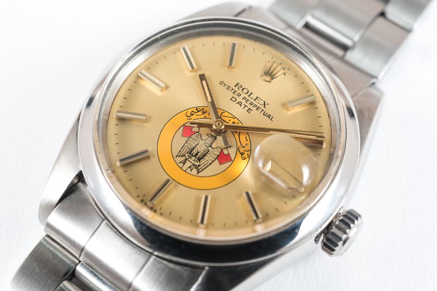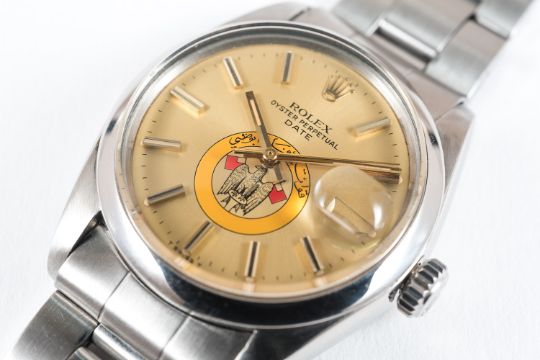 A RARE GENTLEMAN'S STAINLESS STEEL ROLEX OYSTER PERPETUAL DATE BRACELET WATCH CIRCA 1970s, REF. 1500 COMMISSIONED BY ABU DHABI DEFENCE FORCE D: Champagne dial with gilt batons & hands, Eagle crest. M: Automatic chronometer movement, signed Rolex & numbered. C: Oyster case, signed Montres Rolex S.A., numbered, Rolex crown, case diameter measures approx. 35mm. B: Rolex Oyster bracelet. £2,500 £3,500 $3,693 $5,170 AED13,550 AED18,970 CONDITION REPORT D: Original dial in excellent condition. M: Working at present. C: In excellent condition with some light surface scratches. S: In excellent condition. D: Dial / M: Movement / C: Case / S: Strap / B: Bracelet